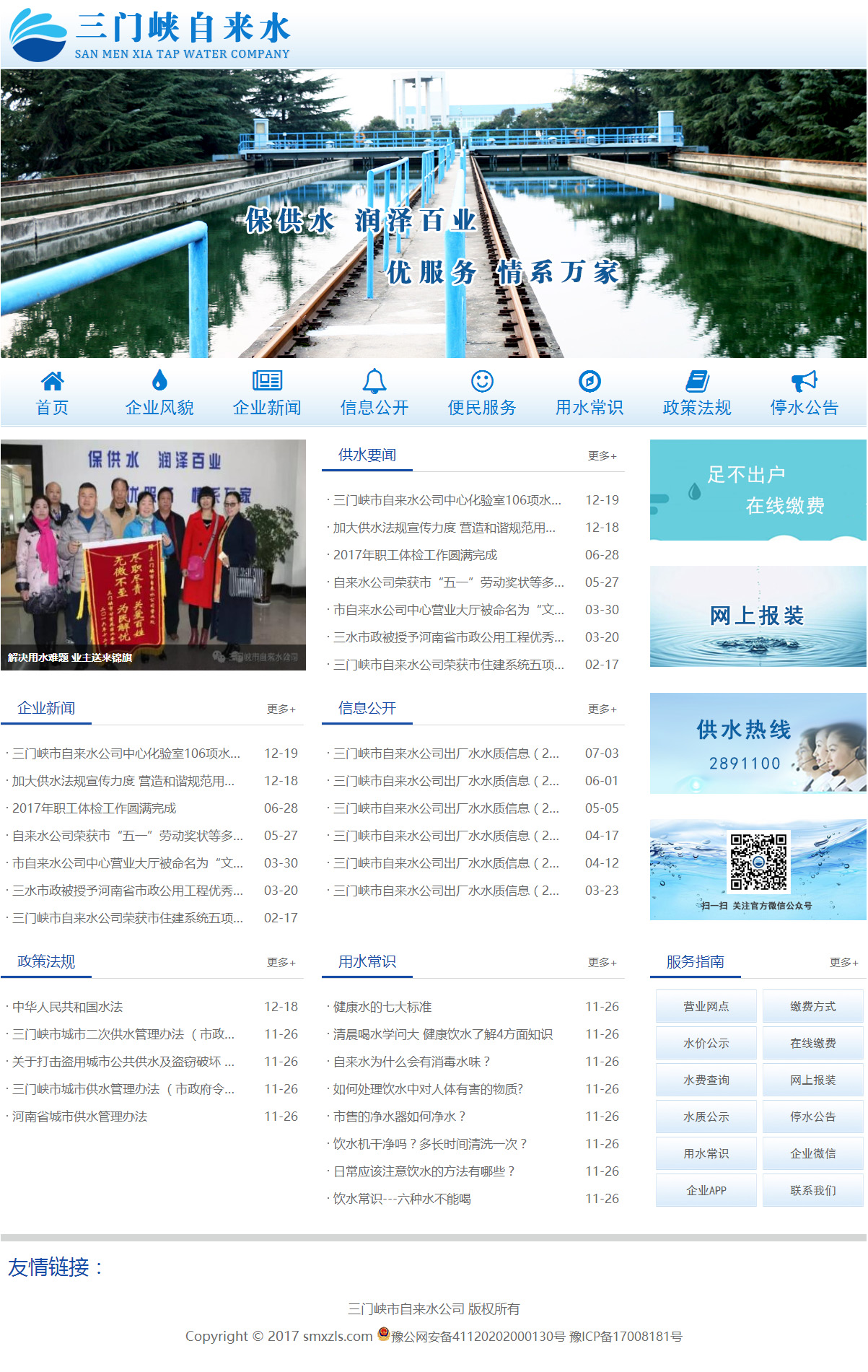 三門峽市自來水公司始建于1956年10月,是伴隨萬里黃河第一壩“三門峽大壩”的建設(shè)而設(shè)立,集產(chǎn)供銷于一體的國有中型城市供水企業(yè),主要承擔(dān)三門峽市區(qū)居民生活、行政企事業(yè)、經(jīng)營服務(wù)等單位的自來水生產(chǎn)供應(yīng)和服務(wù)保障工作。http://www.smxzls.com